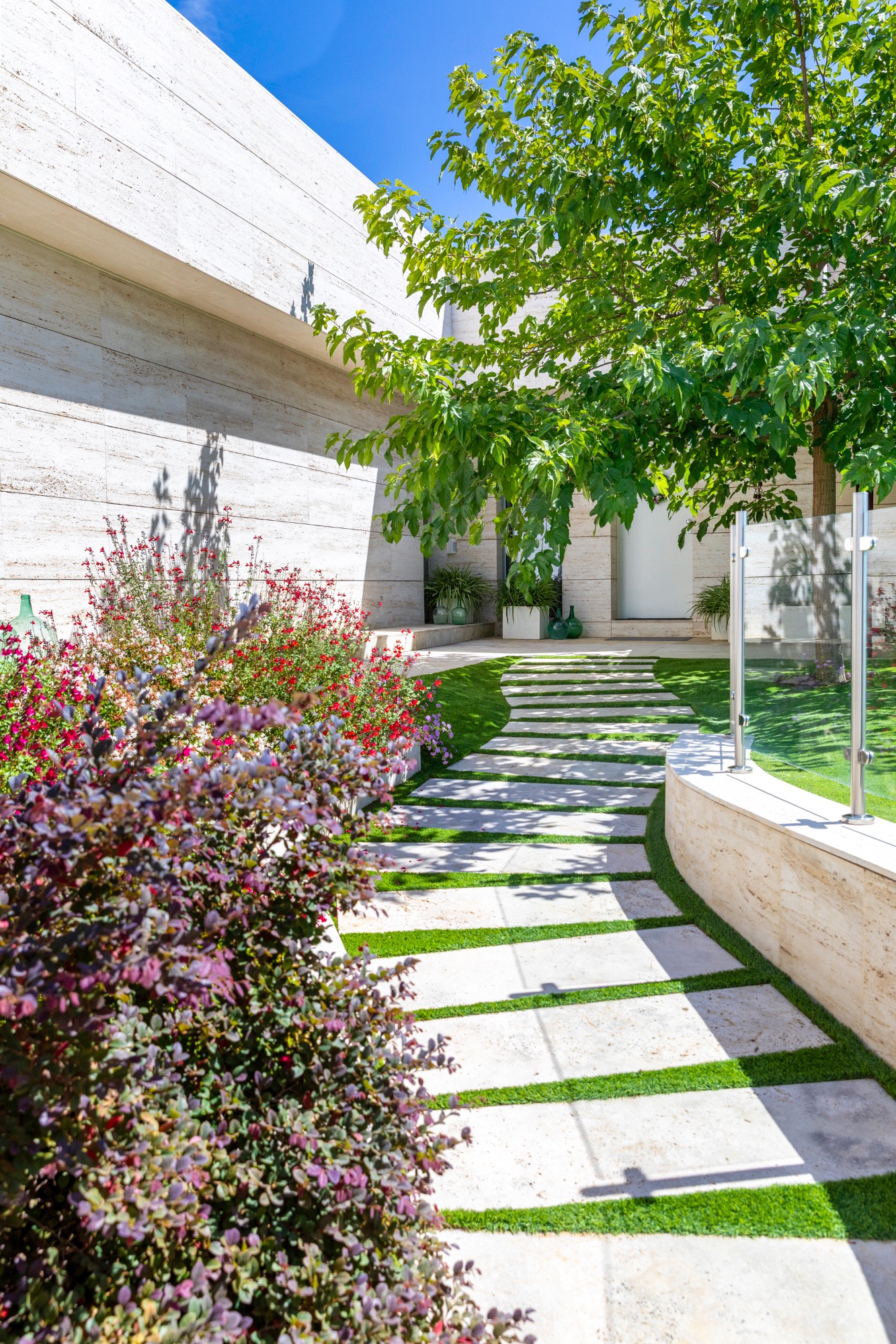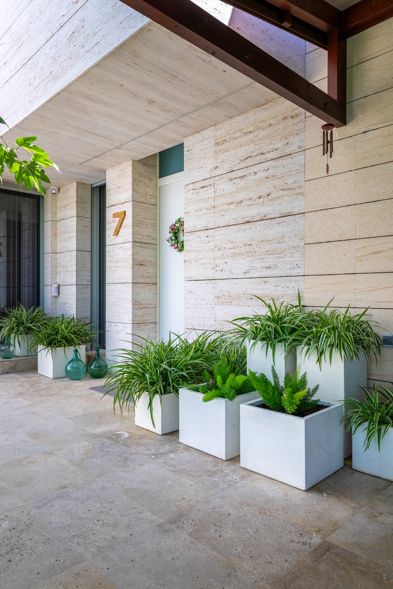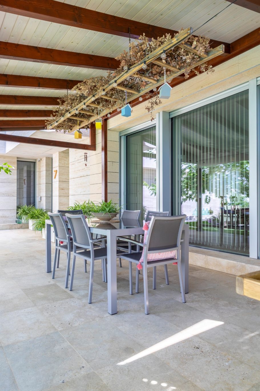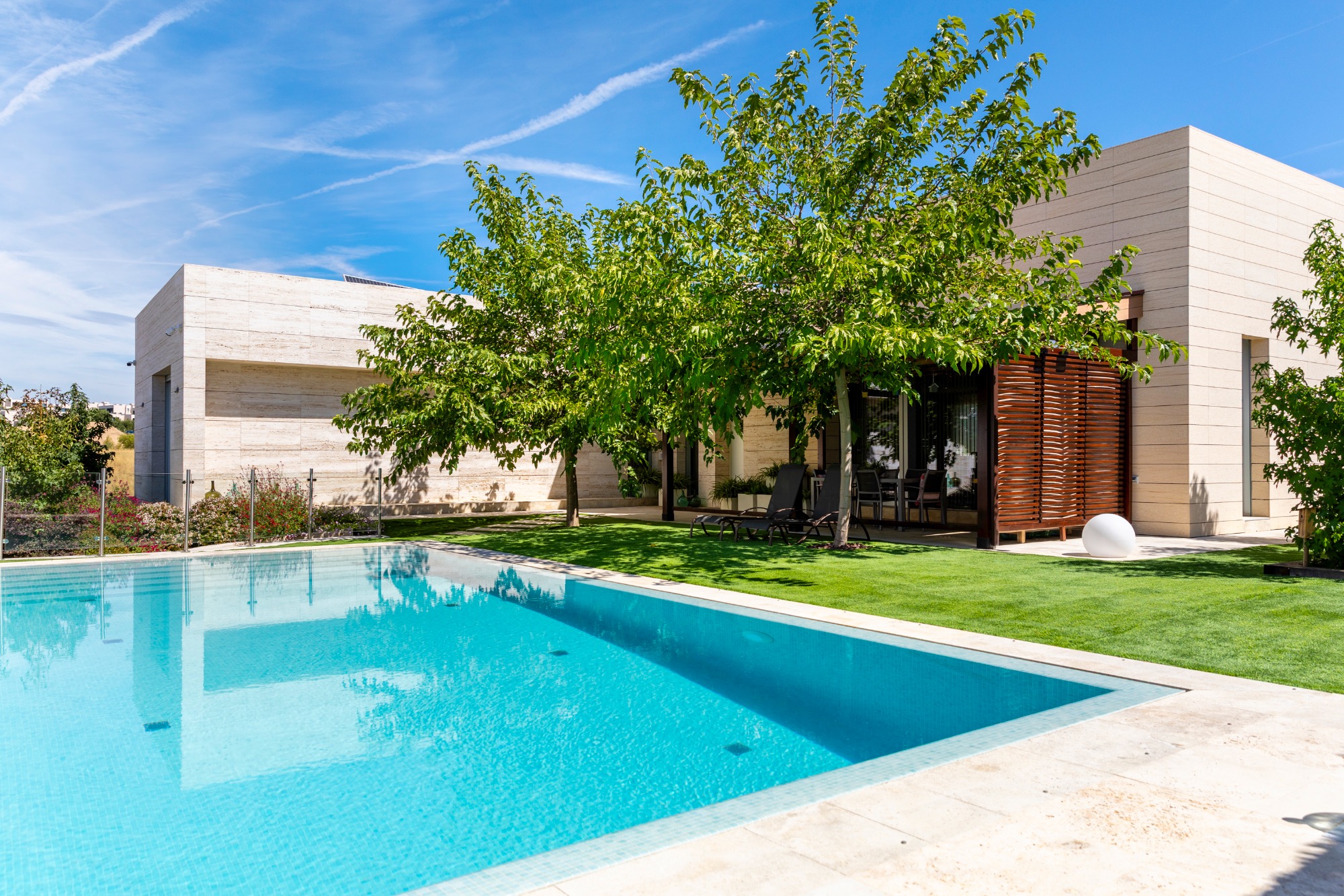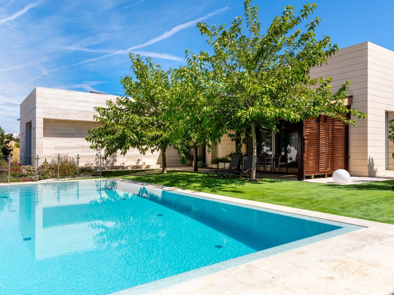 • Fachada de mármol travertino: Su impresionante fachada ventilada, revestida en mármol travertino, no solo le da un aspecto espectacular, sino que también mejora su eficiencia energética.